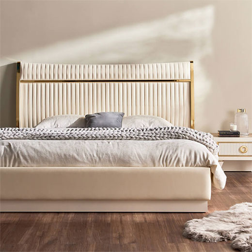 أضفي الحيوية على غرفة نومكِ باقتناء هذا الطقم الرائع. يأتي منجد من القماش الفاخر، بتفاصيل معدنية توفر الملمس والراحة والجاذبية المتطورة، ومزود بلوح رأسي يوفر وضعية نوم جيدة. ومزود بطلاء الميلامين المتين مما يجعله مقاومة للخدش والغبار. كما يمكن تنظيفه بسهولة من البقع.